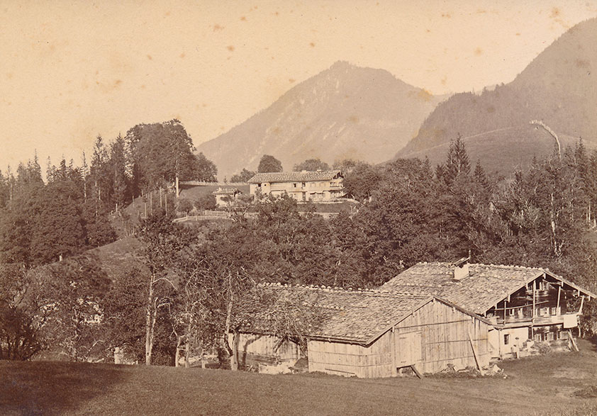 Im Vordergrund das Bodenlehen und am Fuße des Eckerbichls ( heutiger Standort Kempinski Hotel ) das Forsthaus Vordereck um das Jahr 1890