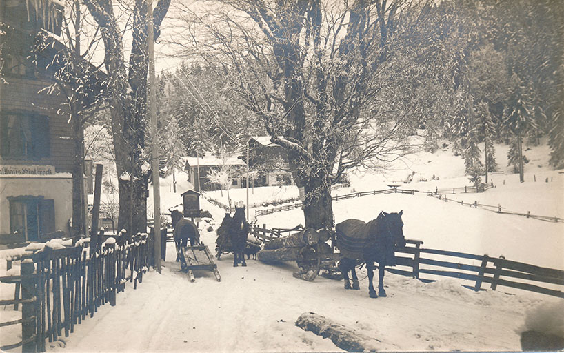 Pferde beim Holzrücken zum Sammelplatz beim ehemaligen Gasthaus Hintereck (links) auf dem Obersalzberg Mitte der 1920er Jahre